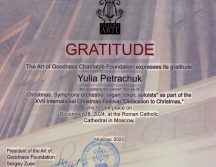 The charitable foundation De Boni ARTE expresses its sincere gratitude to Yulia Petrachuk for organizing the concert Voices of Christmas as part of the 16th International Christmas Festival “A Dedication to Christmas,” held on December 28, 2024, at the Roman Catholic Cathedral in Moscow.